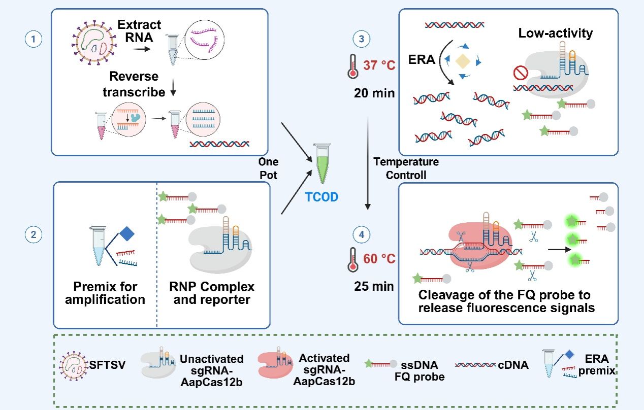 近日,天津大学医学部生命科学学院、天津大学合成生物技术国家重点实验室的王涛教授团队在国际期刊《Sensors and Actuators: B. Chemical》(中科院一区Top期刊)在线发表题为 “A temperature-controlled one-pot CRISPR/Cas12b combined with ERA detection system in SFTSV detection” 的研究论文,报道了一种基于温度控制的CRISPR一锅法检测新体系(Temperature-Controlled One-pot Detection,简称 TCOD),为SFTSV的快速诊断提供了高灵敏度、低成本的新方案。