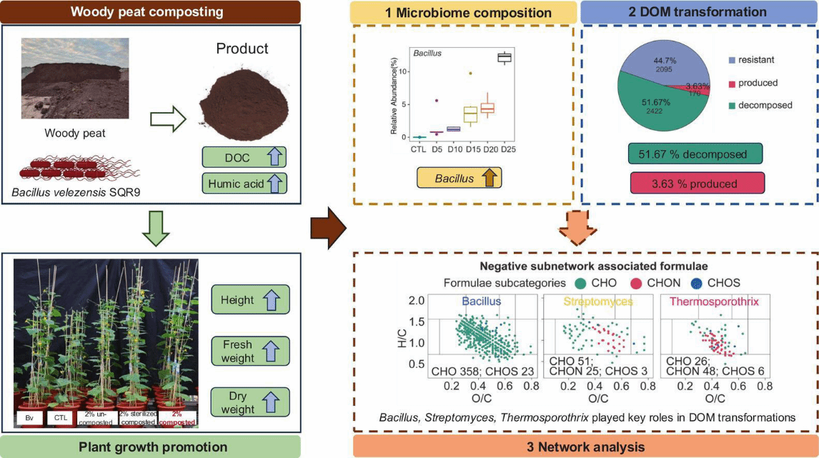 天津大学地科院张坚超副研究员与南京农业大学徐志辉教授合作,通过引入芽孢杆菌(Bacillus velezensis SQR9)进行堆肥处理,成功将木本泥炭转化为富含活性腐殖酸与有益微生物的高效生物肥料。研究发现:使用堆肥后的木本泥炭,黄瓜植株的株高、鲜重和干重分别提高了27%–37%,表现出明显的生长促进作用。通过灭菌对比实验进一步证实,这种促进效果主要来源于堆肥过程中产生的活性物质,而非菌体本身。堆肥后,溶解有机碳(DOC)含量增加18.9倍,腐殖酸含量提升3.7倍。通过高分辨率质谱(FT-ICR MS)分析发现,51.67% 的初始DOM被分解,同时生成3.63%的新型生物活性化合物,这些变化显著增强了养分的可利用性。