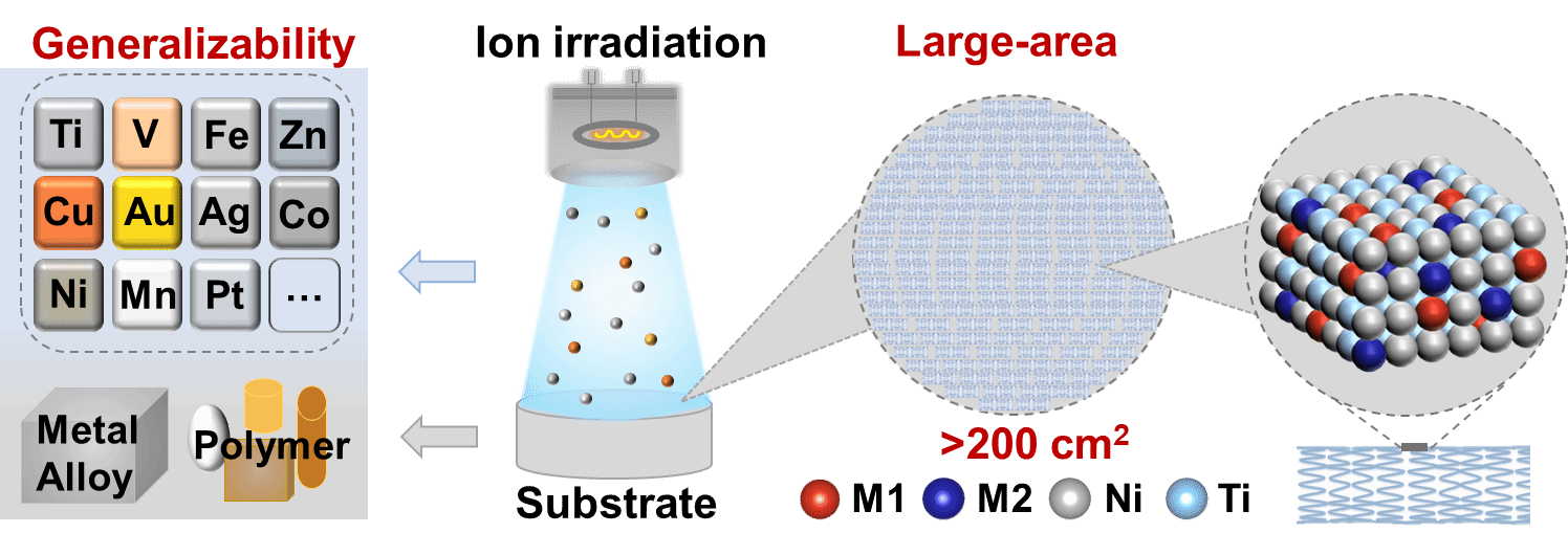 针对这一难题,张晓东教授团队独辟蹊径,提出了一种通用型单原子催化剂制备策略。他们通过机器学习与计算机模拟,从近两万种原子结构中筛选出催化活性最高的原子。然后采用离子注入技术,将活性原子“注入”常用医用镍钛合金的表面,从而实现了单原子催化剂的高效、均匀制备。