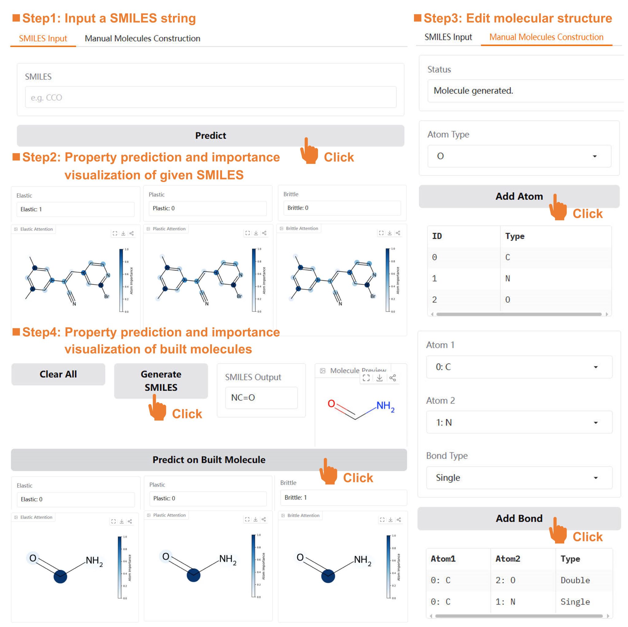 该平台的核心创新在于构建了“数据学习-精准预测-靶点识别-定向改造”的全链条技术体系。通过对晶体结构与机械性质之间的海量关联数据进行深度学习,平台能够快速预测目标有机分子晶体的机械性质。更为关键的是,基于模型的注意力机制,平台可快速识别晶体中影响机械性质的关键原子及官能团片段,并在分子图中予以可视化呈现。因此,研究人员能更准确地锚定目标性质所需的分子改造靶点及官能团片段。相较于传统模式,该平台将晶体改性研究工作从“无方向探索”转变为“精准靶向优化”,在显著加快研究进程、提高研发效率的同时,大幅降低了试错成本。