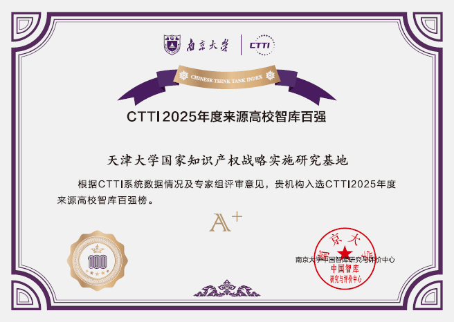 经CTTI系统数据核算和专家评审综合计算,天津大学国家知识产权战略实施研究基地成功入选“CTTI 2025年度来源高校智库百强榜”。据悉,本年度百强榜推介工作依托CTTI系统内810家高校智库的数据开展,根据系统分数以及专家评分,综合得出各家高校智库的“PAI-E”值,由此确定百强榜最终名单。本年度高校智库百强榜推介结果包括A+等级高校智库40家,A等级高校智库60家,值得一提的是,这是研究基地第四次入选高校智库百强,首次跻身A+等级!