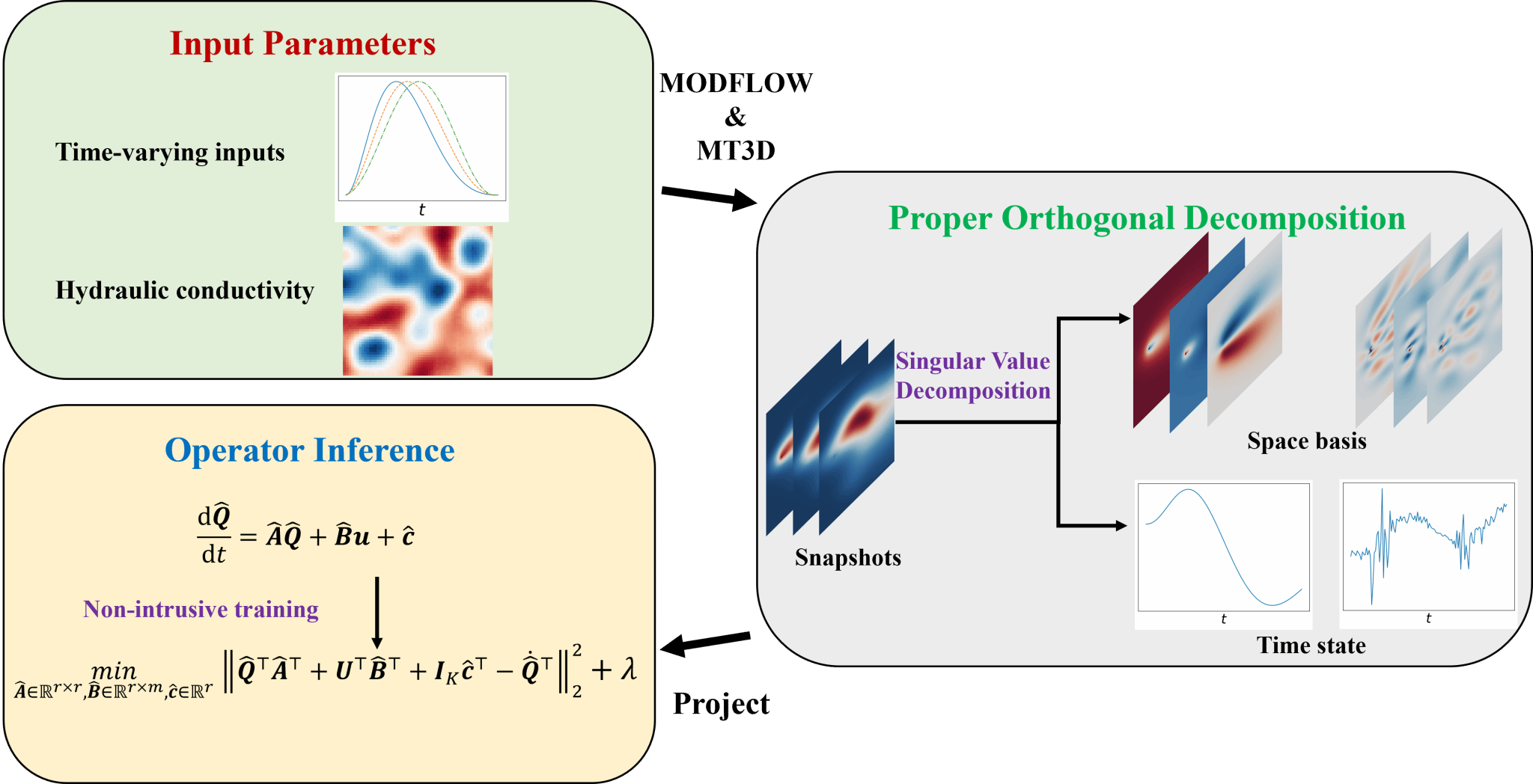 (1)针对传统的深度学习代理模型多属“黑箱”模型,难以在边界条件或源项波动等“分布外”场景中保持有效性问题。提出一种基于算子推断(OpInf)的物理机制代理建模框架。该框架通过最小二乘回归从模拟数据中提取保留原方程数学结构的简化物理算子,显著提升了模型的物理一致性与泛化能力。