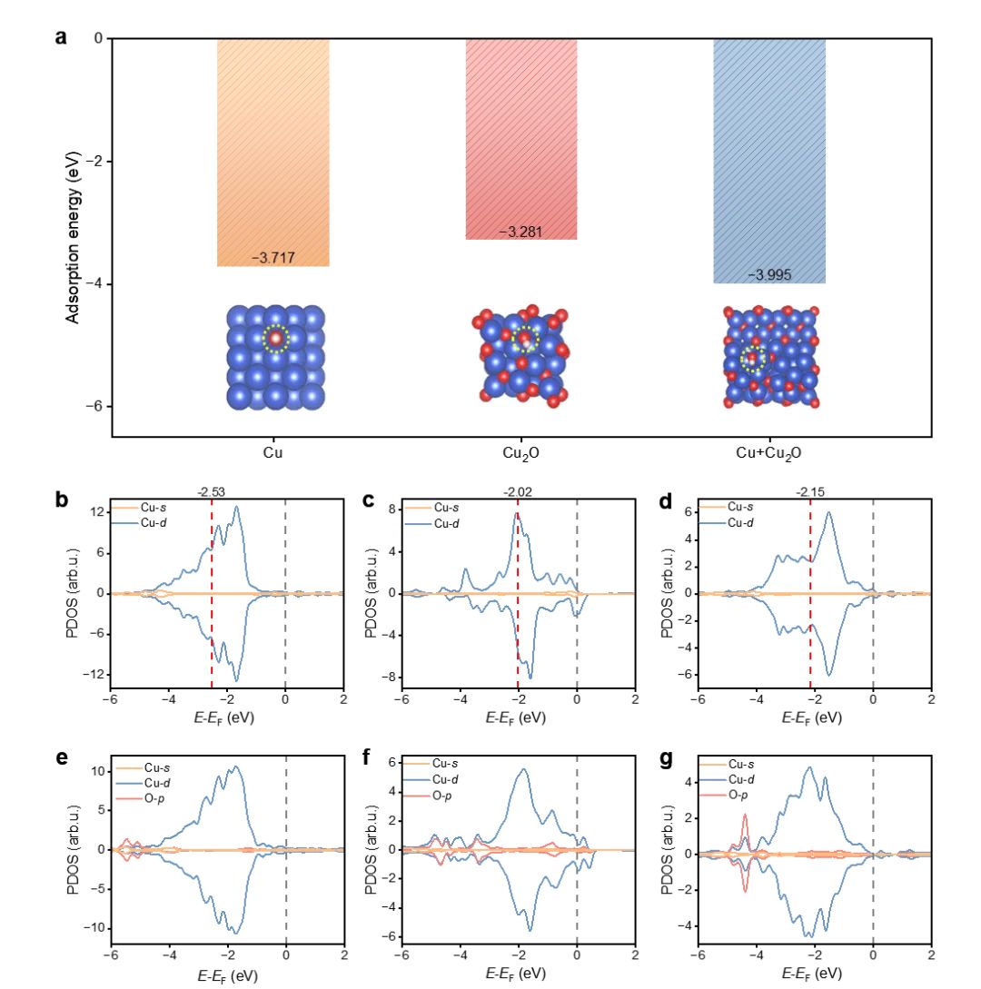 图6.DFT计算表明,OH在Cu/Cu2O混合相界面上的吸附最稳定;电子结构分析进一步说明,这种界面优先稳定化有利于后续氧并入和持续氧化。