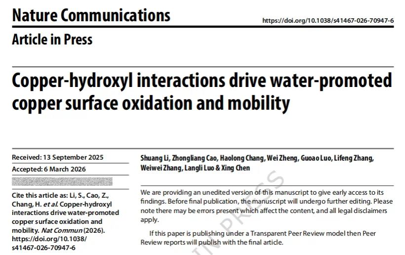 论文题目:Copper-hydroxyl interactions drive water-promoted copper surface oxidation and mobility