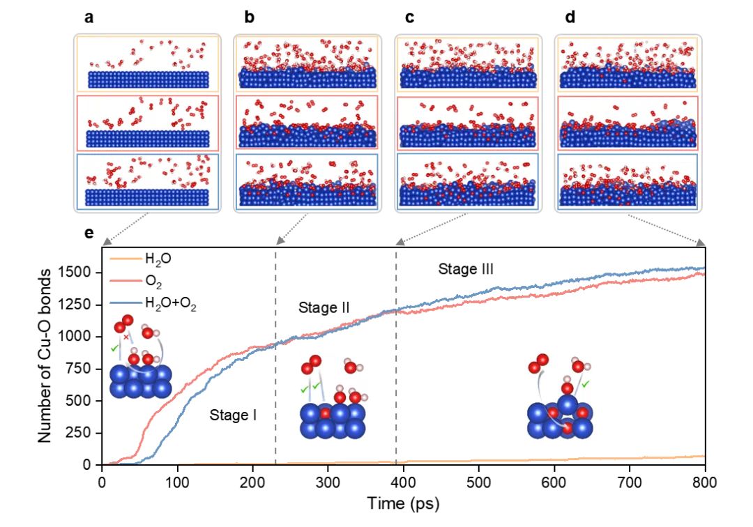 为了理解这两种氧化路径差异背后的原因,团队开展了 ReaxFF 分子动力学模拟,对纯H2O、纯O2和H2O与O2混合气氛下Cu(001)表面的演化过程进行了系统比较。模拟结果显示,氧化过程分为三个阶段:在初始阶段,H2O解离生成的OH会优先占据表面活性位点,从而抑制O原子的直接吸附,使混合气氛下的初始氧化起始慢于纯O2体系;随着反应推进,表面Cu–OH物种逐渐积累,Cu–Cu键被削弱,表面有序性不断降低;在后期阶段,OH持续诱导Cu原子偏离晶格位置,增加表面粗糙度并暴露出新的反应位点,从而促进氧向次表层渗入,最终使混合气氛下的氧化程度超过纯O2条件。(如图2)
