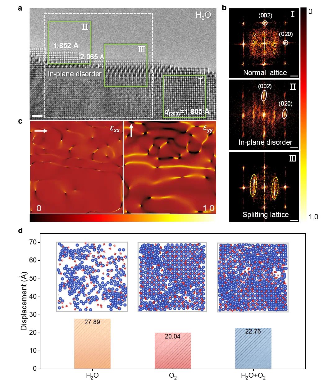 图4.FFT、应变分析和分子动力学统计共同表明,水诱导的结构扰动不仅表现为表面起伏,也表现为晶格面内的局域拉伸和更大的表层Cu原子位移。