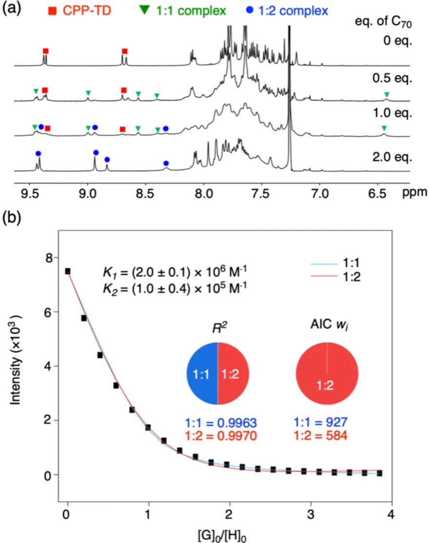 此外,该三层柱状结构内部形成了一个尺寸适宜的纳米级空腔,使其能够作为主体分子识别富勒烯客体。作者通过核磁滴定和荧光滴定实验发现,CPP-TD能够与C70富勒烯形成稳定的1:2主客体络合物。结合常数测定结果显示,其结合常数达到106 M⁻1量级,明显高于传统单环CPP体系,且结合过程由焓驱动,中心环对苯撑层为结合提供了额外的色散稳定作用。这显示出管状分子优异的富勒烯识别能力。