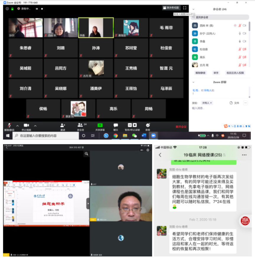 在开学前一周,学部成立了“医学部疫情防控期间在线教学质量保障专家组”,建立专门的“远程教学工作群”,由主任、书记亲自主抓,形成含辅导员、教务员—学部党政分管副职—学部党政正职在内的三级管理机制,层层监管落实,确保教学运行稳步有序开展。教务部门对本学期教学任务逐一核对,针对可开展网络授课的课程制定在线教学方案;针对不支持网络授课的课程合理申请延期或调课;对于与天津医科大学合作办学专业的课程及联合培养学生,与天津医科大学相关教务部门以及师生进行了全方位对接,建立课程协调工作群,将两校互开的课程进行一一协调落实,在达成共识的基础上调整双方的课程表,并克服技术困难实现了两校学生名单互录网课平台系统。