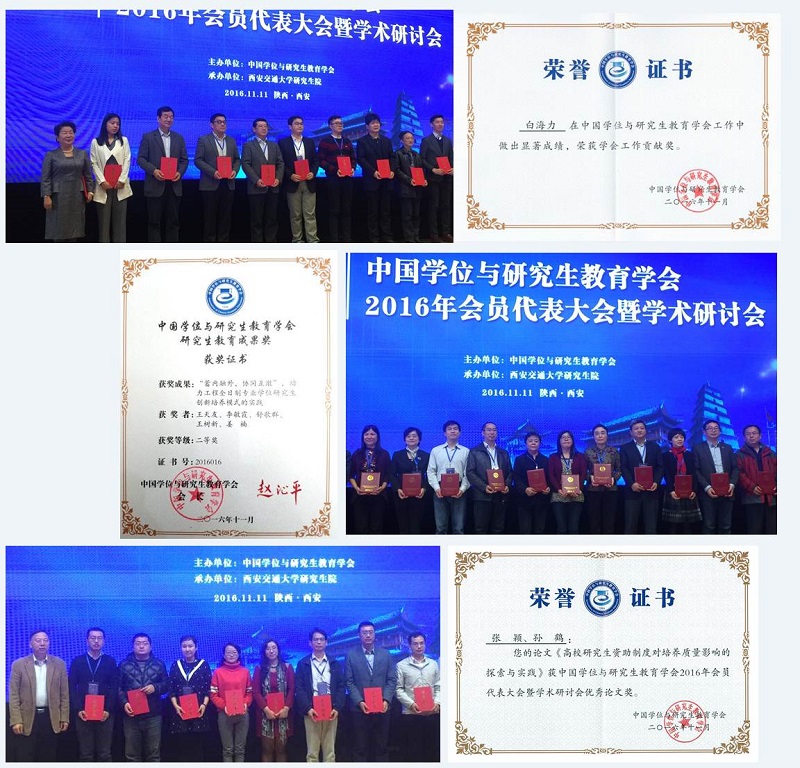 本次大会的颁奖仪式上,机械学院的申报项目《“蓄内融外 协同互激” 动力工程全日制专业学位研究生创新培养模式的实践》荣获第二届中国学位与研究生教育学会研究生教育成果奖二等奖,机械学院副院长王天友代表成果完成人上台领奖。白海力荣获第一届中国学位与研究生教育学会工作贡献奖,张颖、孙鹤两位老师的论文荣获中国学位与研究生教育学会2016年学术研讨会优秀论文。本次大会上,教育学院王梅老师被推选为中国学位与研究生教育学会会员部理论研究分部副秘书长。此外,今年我校3名工程硕士荣获全国工程专业学位教指委评选的“工程硕士实习实践优秀成果获得者”,13个项目获得全国工程专业学位研究生教育研究课题立项。这些荣誉和成绩集中体现了我校研究生教育综合改革的成果,进一步提高了天津大学在全国学位与研究生教育领域的影响力。