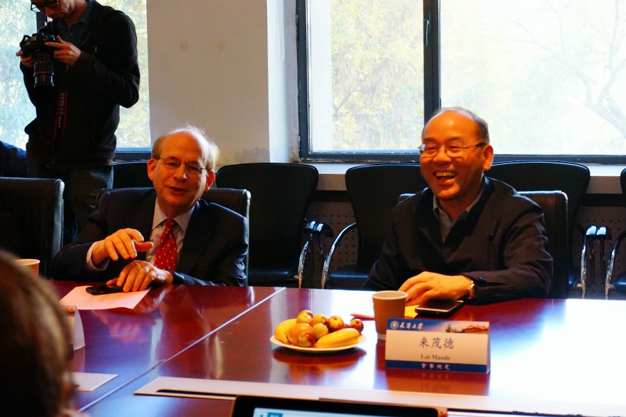 David Leebron校长详细询问了学院在天津大学工科教育背景下,如何培养学生艺术与人文素质的问题,深入了解了学生专业选择的自由度、就业情况、参与国际交流比例等情况,并就中美院校教学培养方式的差异与在座老师们进行了探讨。