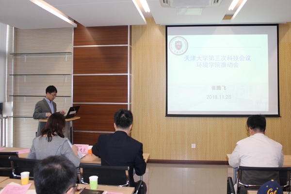 副院长张腾飞向参会的全体教工传达了天津大学第三次科技推动会的会议精神,并回顾了环境学院近年来的科技进展,分析了环境学院新利18网址登录