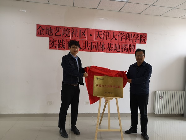 最后,刘洪涛和荣渤焜共同为“理学院团委-金地艺境社区实践育人共同体”揭牌。