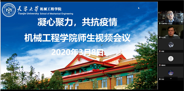 本站讯(通讯员 孙明辉 郑超)当前,新冠肺炎疫情形势依然严峻。3月8日上午10:00,机械工程学院通过“腾讯会议”平台组织召开了题为“凝心聚力、共抗疫情”的师生视频会议,深入了解目前在湖北省的同学居家学习、生活情况以及现阶段存在的问题和困难等。院长王天友、党委书记孙月海、党委副书记刘岳,辅导员孙明辉、谭耕耘、郑超、任畅,以及目前在武汉市及湖北省其他城市的本硕博19名学生代表参加了会议。会议由刘岳主持。
