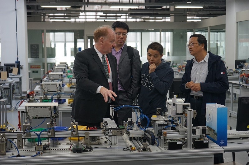 Anton Peter Jacob Middelberg专家在自动化学院邓斌副主任、李刚老师的陪同下,走访了天津大学校外实习基地中国天津职业技能公共实训中心。Anton Peter Jacob Middelberg专家先后走进现代控制技术实训中心、现代制造技术实训中心、现代物流领域实训中心、现代电子技术实训中心、信息技术实训中心,全面了解学生实习实训情况,同时就学校人才培养目标如何贴合与企业的人才需求度,实训中心容纳规模、实训课程设置等一系列问题与实训中心刘玉亮主任进行深入交流。通过交流,Anton Peter Jacob Middelberg专家对实训中心的设备规模、服务功能、运行机制、培训模式等赞不绝口,并高度评价了学校对于学生专业实践能力培养的重视程度。