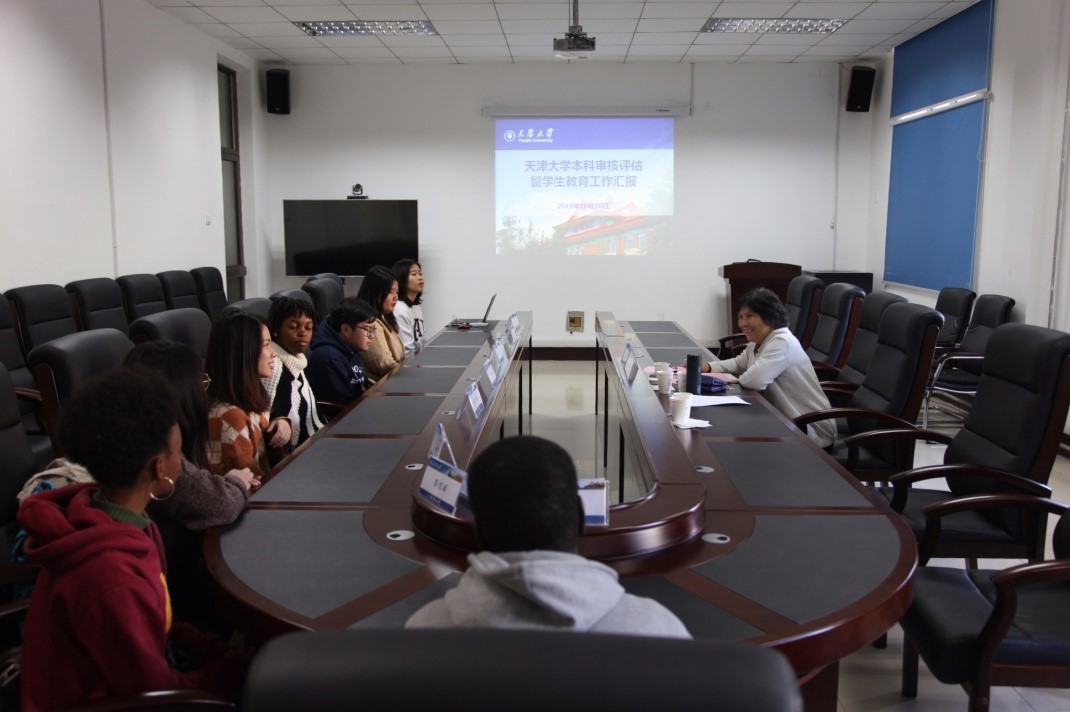 本站讯 10月10日上午,本科教学审核评估专家史静寰教授到国际教育学院调研走访。她听取了国际教育学院院长陈志华对天津大学外国留学生情况的总体介绍,并和8名来自不同专业和国家的外国留学本科生进行了座谈。
