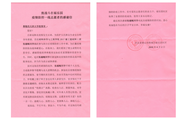 本站讯(通讯员 杨威)近日,河北省唐山市路南区友谊街道福乐园社区居委会给天津大学材料学院寄来一封感谢信。感谢我校返乡大学生志愿者张越鲲为疫情防控工作做出的贡献,感谢他在防疫一线勇于担当、勇于作为的奉献精神,同时高度赞扬我校在立德树人、人才培养方面所作的努力。