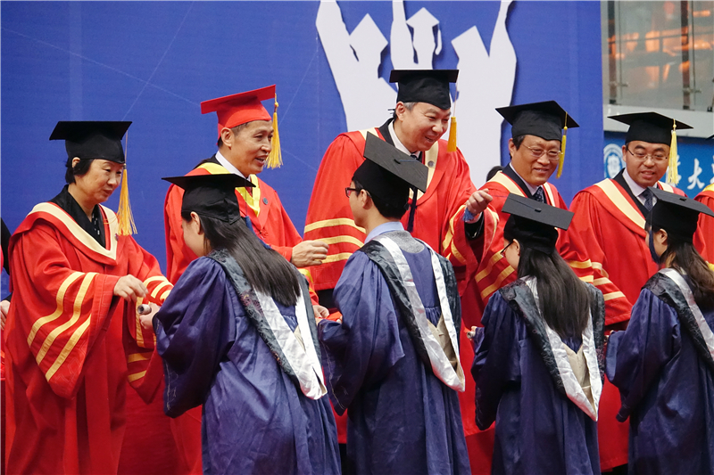博士毕业生依次走上主席台,由校领导、学位委员会委员代表为他们授予学位、拨动流苏;随后,硕士毕业生依次走上主席台,由校领导、各学院领导和学位委员会委员代表为他们授予学位、拨动流苏。