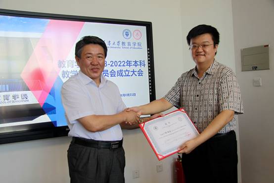 副院长朱红春宣读了《教育学院关于成立2018-2022年本科教学指导委员会的决定》,宣布了教育学院2018-2022年本科教学指导委员会成员名单,教育部教育学本科教学指导委员会副主任委员柳海民教授担任主任委员,成员包括东北师范大学教授马云鹏、天津市教育督导专家王学兰等校内外专家学者。教务处副处长靳楠为本科教学指导委员会委员颁发聘书。