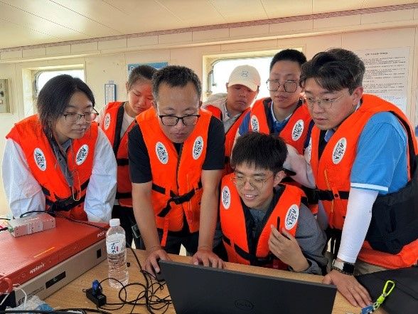 当日同学们分成两个批次乘船驶往测区,大家克服风浪大晕船等诸多困难,在学院专业老师与企业导师共同指导下,完成仪器设备安装、参数设置、仪器下放与回收、数据采集与记录等工作,热烈讨论、逐一操作,确保每位同学都能够了解并掌握海洋测量实际操作的技术细节。