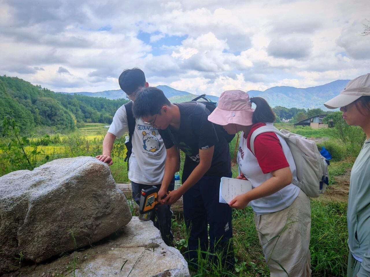 在东京大学高桥嘉夫教授带领下,团队前往筑波山及周边区域,使用便携式能谱仪测定花岗岩中稀土元素含量。高桥教授结合实测数据,讲解稀土矿床形成机制,剖析降水、温度等气候因素与坡度、坡向等地形条件对稀土元素富集的影响,并指导学生通过“气候条件+花岗岩风化程度”预判日本潜在稀土矿床发育区域,实现理论知识与实操技能的深度融合。