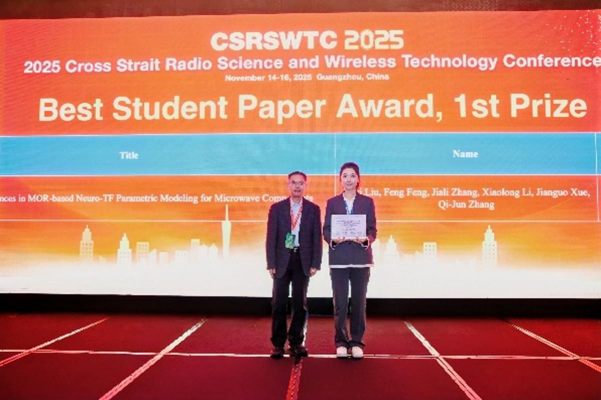 本站讯 11月14日至11月16日,第28届海峡两岸无线科学与技术会议(CSRSWTC 2025)在广州召开。本届CSRSWTC会议共录用论文397篇,其中63篇参与最佳学生论文竞赛。经过综合评审,最终评选出6篇最佳学生论文,包括1名一等奖,2名二等奖和3名三等奖。天津大学微电子学院互联感知集成电路与系统团队冯枫教授课题组的博士生刘谨仪,以其论文《Recent Advances in MOR-based Neuro-TF Parametric Modeling for Microwave Components》最终从63篇投稿学生论文竞赛的论文中脱颖而出,荣获最佳学生论文竞赛奖的唯一一等奖,指导教师为冯枫教授。