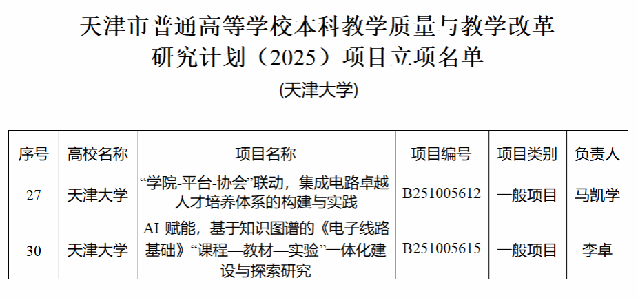 本站讯 近日,天津市教育委员会相继发布首批天津市级普通高校新形态教材建设项目及2025年天津市本科教学质量与教学改革研究计划项目立项名单,我院申报的4个项目全部获批立项,其中《系统级芯片(SoC)设计》《电子线路基础》获批新形态教材建设立项、《“学院-平台-协会”联动,集成电路卓越人才培养体系的构建与实践》《AI赋能,基于知识图谱的〈电子线路基础〉“课程—教材—实验”一体化建设与探索研究》获批本科教育教学改革项目立项。