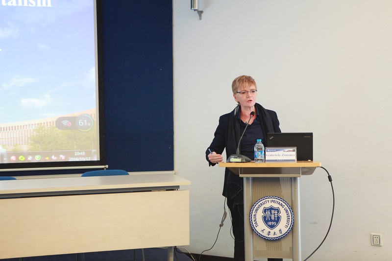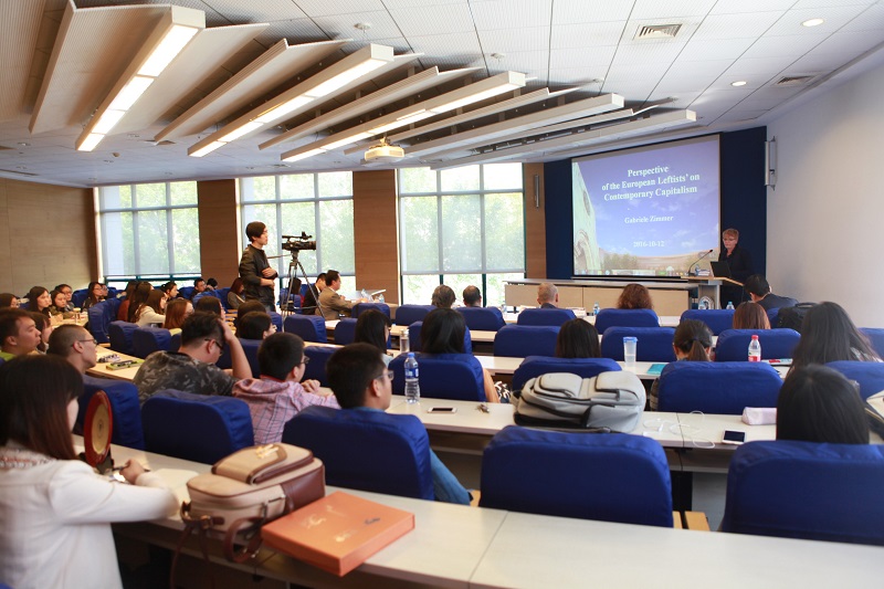 论坛主要围绕“欧洲金融危机以来资本主义现状、挑战与前景”主题展开。左翼政党社会活动领导人齐默尔女士从自己所处的时代背景和生活经历出发对欧洲当下社会问题及左翼联盟党团发展现状做了大体介绍。她认为当前的欧洲社会和左翼党团呈现出前所未有的复杂性同时左翼运动成员正在面临社会公众的挑战。她说对解决资本主义矛盾方式持有不同的看法是社会发展的动力,就如何改善公众的生存条件和生活环境这一问题欧盟成员国与非成员国给出了不同的方案。这是由于双方在这一问题上缺少共同建立团结、和平、民主欧洲的美好愿景。她还指出资本主义社会对当下存在的社会不平等、贫富差距等现实问题并未给出明确的解决措施。以现今全球共同面临的气候变化问题为例表示欧洲国家应为控制全球变暖继续努力,而改善人文生活、实现深刻变革必须要建立在各方面团结的基础上。她还指出,德国左翼党致力于人的解放、性别平等、环境保护、消除人对人的剥削等共同目标的实现上,承担自己的责任和对他人的责任是一项长期事业需要持久的坚持。