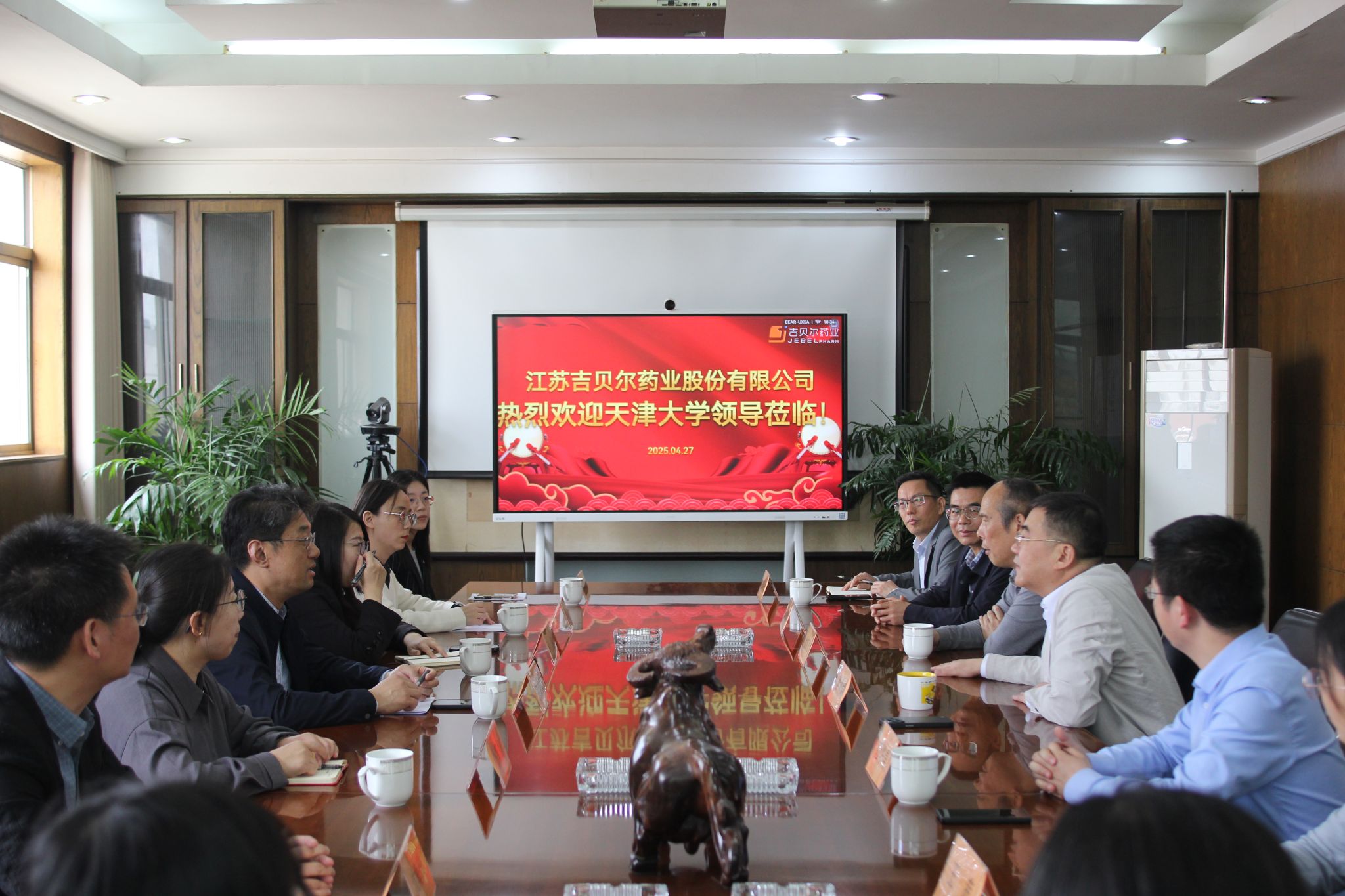 随后,调研团队一行前往江苏吉贝尔药业有限公司。该公司为科创板上市公司,以创新药研发为核心,拥有片剂、胶囊剂、滴眼剂等五大剂型生产线,覆盖多个治疗领域,并布局抑郁症、肿瘤等重大疾病创新药的研发。公司董事长耿仲毅,副董事长俞新君,副总工程师、研究所所长吴修艮,人力资源部部长唐诗云等多位高管出席会议。双方就药物筛选技术、人才引进计划等关键问题展开深入交流。