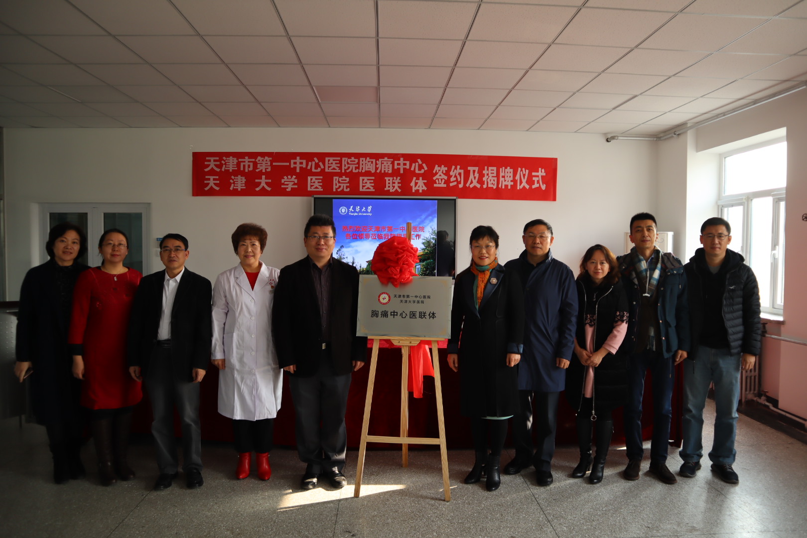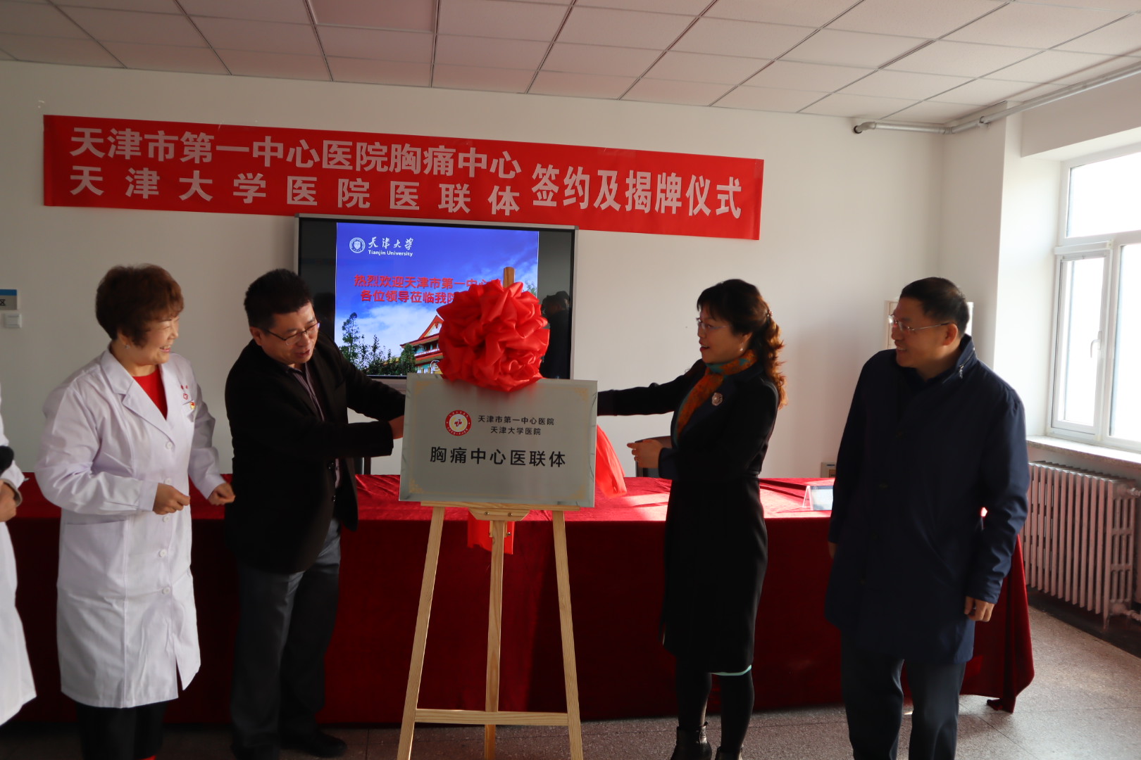 优势和深厚的文化底蕴,推动学科建设和人才培养再上新台阶。与校医院一道,戮力同心,务实合作,更好地为天大师生的健康保驾护航。卢成志和张长福分别代表校医院和第一中心医院胸痛中心讲话。卢成志表示将不忘初衷,努力把胸痛中心的本职工作做好,通过合作把健康的理念传播给大家。张长福表示将以此次医联体建立为契机,全面提升校医院医疗质量和水平,更好地为全校师生服务。唐兆贺与张长福代表天津市第一中心医院和天津大学医院签署了医联体合作协议书,赵翠云与唐兆贺为医联体牌匾揭牌。