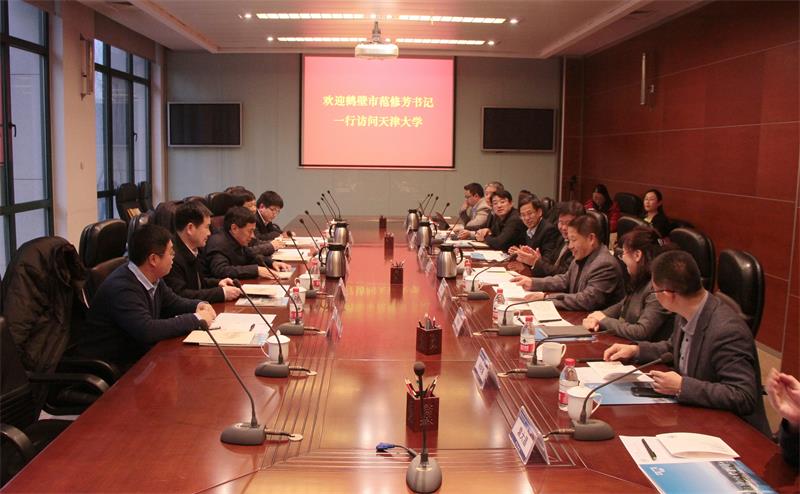 本站讯(通讯员 孙亮)12月9日下午,河南省鹤壁市市委书记范修芳一行5人访问天津大学,洽谈市校合作相关事宜。校党委书记、校友总会会长刘建平在卫津路校区会议楼贵宾室亲切会见来宾,副校长、新利18网址登录 院院长、校友总会副会长元英进与来宾在第一会议室举行了工作会谈。鹤壁市委常委、市委秘书长李成宽,科技局局长秦志军,规划局副局长李松涛,国立光电董事长朱明甫陪同来访;设计总院院长洪再生、党委书记余敬海,校友总会常务副秘书长、校友与基金事务处处长李秀民,海洋学院党总支书记、常务副院长牛志广,新利18网址登录 院副院长杨明海,设计总院副院长张锡治、袁大昌,经管学部党委副书记施亮星等陪同会见及会谈。