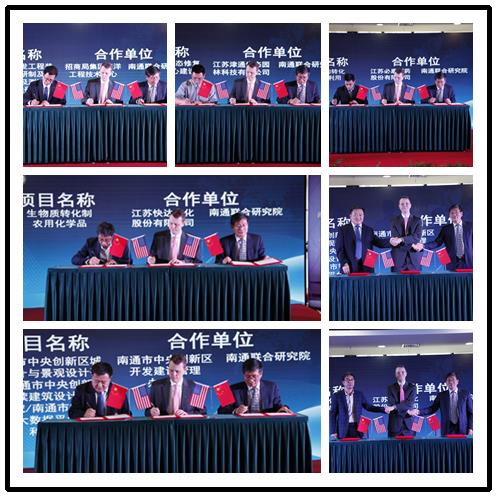 在技术交流环节,南通市建设局(南通市轨道建设安全评估与控制技术和海绵城市建设项目)、南通四建集团有限公司(南通地铁安全建造技术研究、基坑施工对邻近地铁设施保护技术研究两个项目)、江苏津通生态园林科技有限公司(共建江苏省沿海滩涂生态重建技术工程中心等)、南通市中央创新区开发建设管理办公室(南通市中央创新区城市设计与景观设计研究/南通市中央创新区可持续建筑设计与技术研究/南通市智慧城市和大数据平台规划和建设项目)、江苏必康制药股份有限公司(生物质的转化与药物利用项目)、江苏快达农化股份有限公司(生物质转化制农用化学品项目)、招商局集团海洋工程技术中心(深海资源工程装备设计、制造、安装及评价项目)等7家单位分别与联合研究院的中外方代表签订了8个项目合作协议,这些项目都是和联合研究院上述3个中心的研究方向密切相关的,也为联合研究院的近期工作确定了较为明确的目标。这也是前期对接洽谈结下的累累硕果。