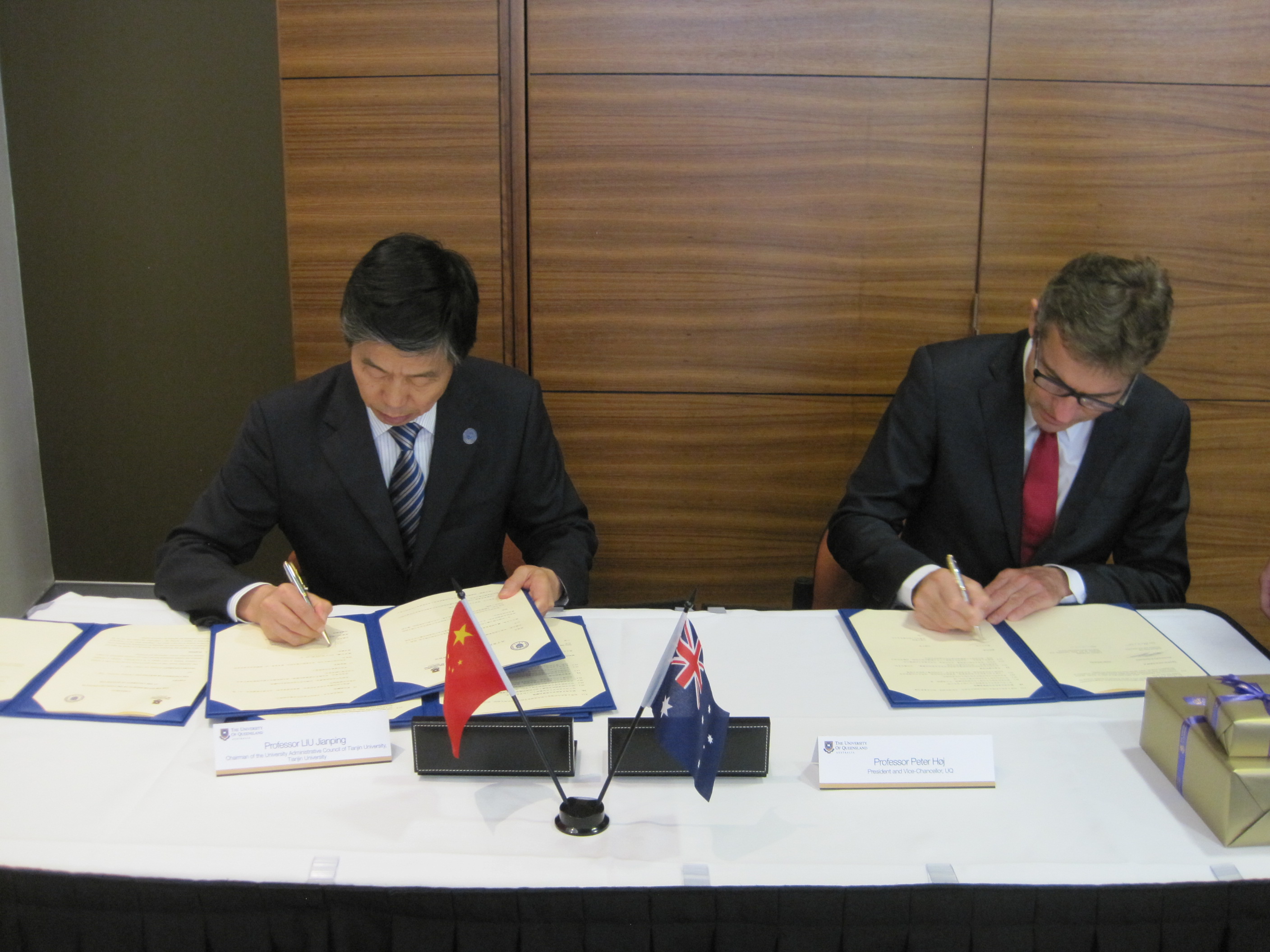 副校长Aton Middleberg及相关学院院长的共同见证下,Peter Høj校长向刘建平书记颁发了昆士兰大学荣誉教授证书,并对刘建平在促进两校全方位深度合作方面所作的突出贡献予以高度评价。刘建平向昆士兰大学授予自己此项殊荣致以衷心的感谢,并表示这不但是自己的个人荣誉,也体现了昆士兰大学对天津大学的高度重视和认可,使两校的交流合作提升到了新的高度和平台。授予仪式后,双方签署了《关于共建中澳合成生物学研究中心的备忘录》、《天津大学与昆士兰大学关于博士双学位项目的备忘录》和《关于在昆士兰大学建立孔子学院的协议》等三项协议并代表两校交换了礼物。