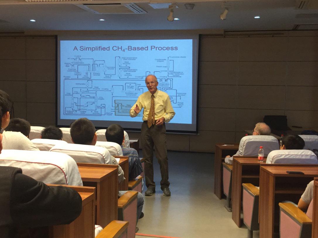 访问期间,Edward L.Cussler教授还在第26教学楼为学校师生作了题为“An Alternative Ammonia Synthesis”的学术讲座。讲座介绍了一种将风能、膜技术、制氢技术相结合生产合成氨的新方法。这种方法通过小巧的设备,利用电解水中的氢气和膜分离空气中的氮气,简便高效地实现了氨的合成。讲座还分析了这种分散式合成氨技术在不同地区应用的可行性及其广阔的发展前景。Cussler教授的幽默风趣和对国际化工大方向的洞察能力、以及他将科学理论大胆用于工程实践的学术风格,使师生受益匪浅。