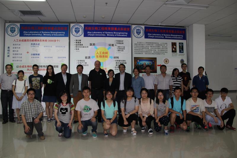 Rettberg一行参观了天津大学武清前沿技术研究院。化工学院教授宋浩详细介绍了天津大学合成生物学研究方向及进展。天津大学2015iGEM队长刘悦介绍了我校iGEM的组织方式及我校自2007年以来参加iGEM竞赛所取得成绩和收获。来宾对天津大学在合成生物学领域取得成就表示了肯定,同时对天津大学iGEM队伍的发展和取得的成绩给予了很高评价,并为队员深入细致的介绍了iGEM今年在赛程和评价标准上的变化。Rettberg真诚地祝愿天津大学iGEM团队能够在今年的大赛中再创佳绩,并希望中国在合成生物学领域取得长足发展。