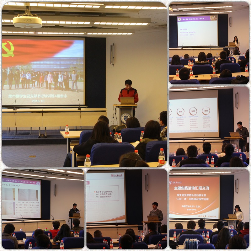 特色和学生党支部书记工作优秀案例进行汇报展示,汇报主题包括支部理论学习方式创新,学生党支部、班级、团支部协同建设,研究生组织生活开展等内容。