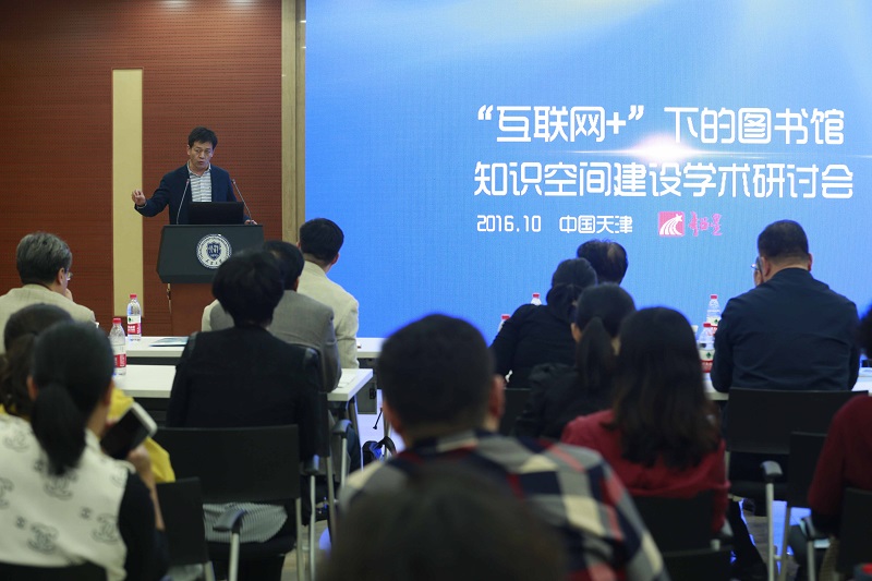 本站讯(田丽娜)10月12日,由天津大学图书馆和超星集团天津分公司联合举办的“‘互联网+’图书馆知识空间建设学术研讨会”在天津大学科学图书馆召开,南京航空大学副校长、原北京航空航天大学图书馆馆长杨晓光,宁波大学园区图书馆馆长颜务林,及天津市各高校图书馆、高职院校图书馆、公共图书馆、部分医院图书馆等馆长和相关工作人员140余人参加了此次会议。