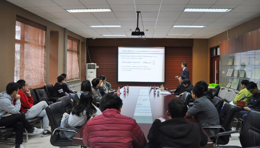 报告开始,何文龙教授简要介绍了太赫兹技术在通讯、遥感、磁共振、医学及科学仪器等领域的应用前景。之后对高功率太赫兹源以及宽带太赫兹放大器进行了详细介绍,其中着重讲解了回旋行波管放大器的工作原理、设计方法以及实验结果。在交流环节中,何文龙教授与在场的老师及同学就太赫兹放大器的可靠性及太赫兹技术的微纳尺度化等问题进行了深入的探讨,同学们亦踊跃提问,并得到了何文龙教授认真的解答和赞赏。
