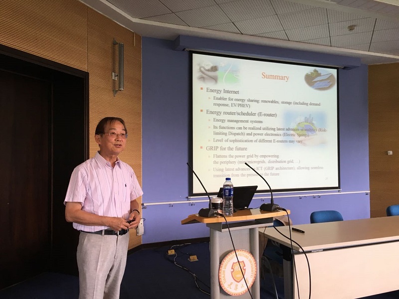 报告中,吴复立从能源互联网谈起,结合现有电网结构分析了实现能源互联网面临的挑战,进而讲解了基于责任与经济共享的具有智能终端未来电网(GRIP)的构想,探讨了GRIP中E-router的基本功能,并从风险管理调度、电力弹簧和选择性非关键负荷/发电切除三方面阐述了最新研究进展。报告中提出的诸多新理念得到了现场师生的强烈反响。