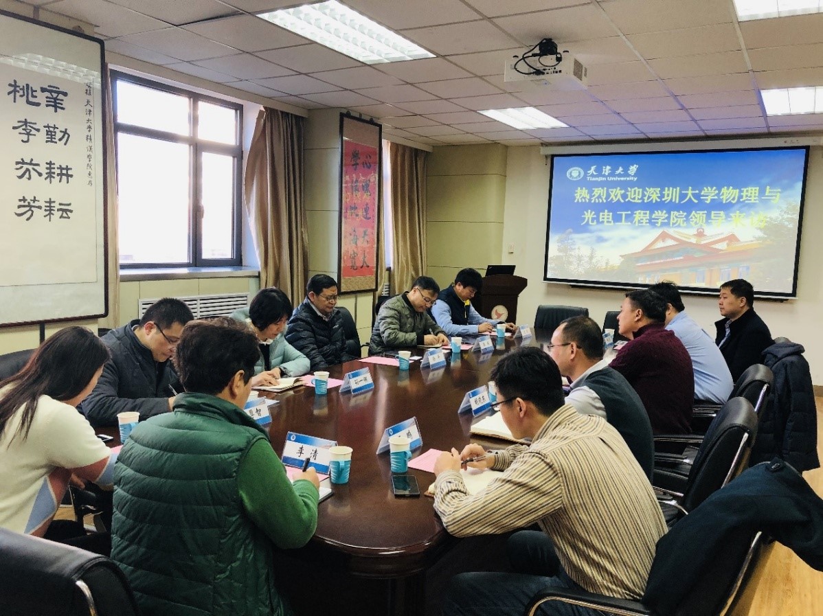 本站讯(通讯员 黄靖雯)12月4日,深圳大学物理与光电工程学院院长徐平、副院长王楠、副院长孙一翎、光电信息与科学系主任文侨、测控技术与仪器系主任蔡厚智一行5人访问天津大学精仪学院。精仪学院院长曾周末、副院长胡晓东、副院长田震、精密仪器工程系副主任王鹏、光电信息工程系副主任杨磊会见来宾并座谈。