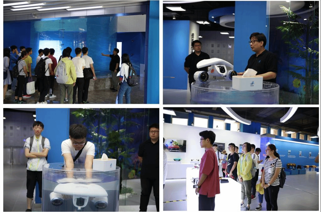 深之蓝是国内首家专业从事全系列水下机器人及相关水下核心部件研发、制造、销售的高新科技企业。刘奇为同学们详细介绍了深之蓝的成立背景、发展历程,以及在工业级和消费级产品上的持续创新与深耕,并结合视频讲解了其产品在水下工程、水下打捞救助、海洋勘测等领域的应用实例。在公司展厅中,同学们零距离接触了在习近平总书记新年贺词中提到的“海翼”水下滑翔机、获“红点奖”的水下观测机器“白鲨Max”等产品,并亲自体验了白鲨Mix水下助推器的操控,进一步感受到科技创新的魅力。