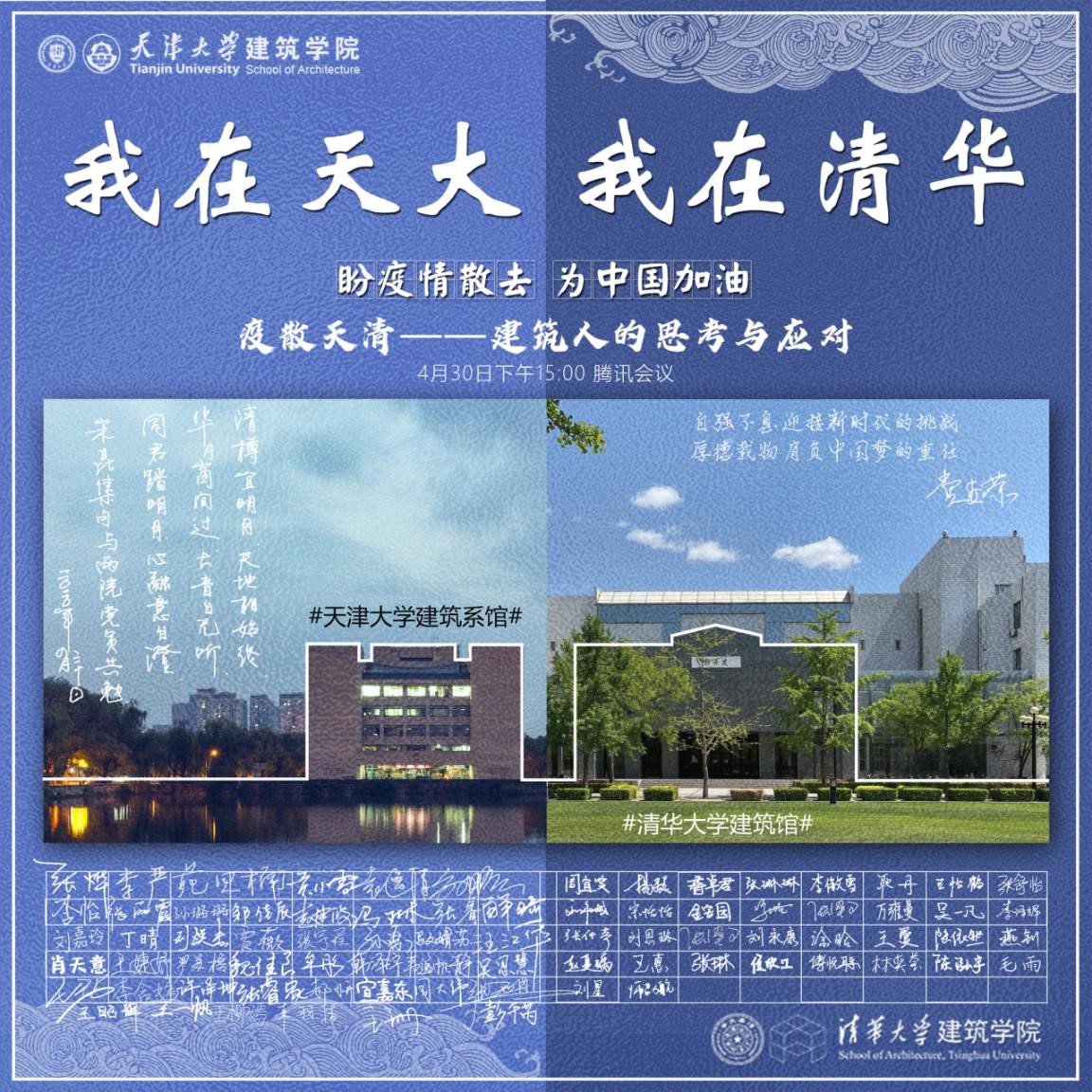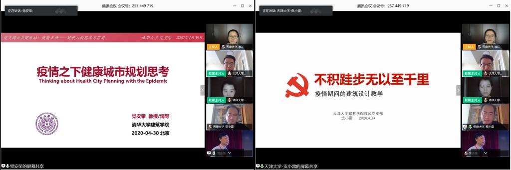 本站讯(通讯员 李怡 孙源)冬雪融化,新叶发芽,春光正盛,沉睡中的城市重新焕发着希望与生机。在党中央的坚强领导下,集中力量办大事的制度优势充分发挥,各行各业的人们全力配合共同战“疫”,党员同志始终冲在抗击疫情的第一线,疫情整体防控形势正持续向好。为推进党组织生活正常化、党员教育管理常态化,充分体现党员的先锋模范作用,反思建筑人在这场战“疫”中能够贡献的专业力量,天津大学与清华大学建筑学院两院共8个师生党支部联合,于4月30日下午开展“主题为“‘疫’散天清——建筑人的思考与应对”的党支部云共建,两院师生共计138人参与了此次活动。