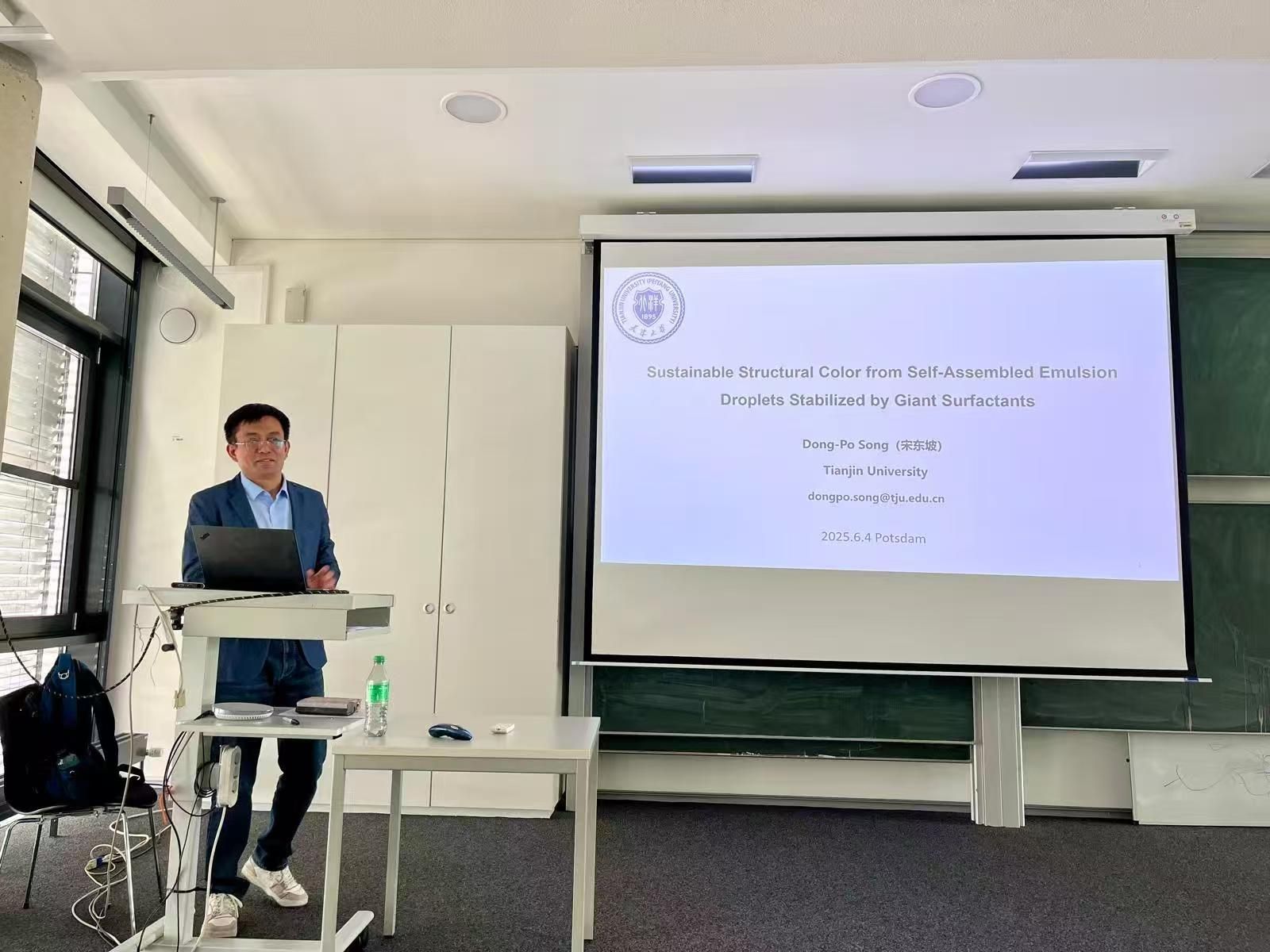 同时,宋东坡教授为马普所的师生带来了题为"Sustainable Structural Color from Self-Assembled Emulsion Droplets Stabilized by Giant Surfactants"的学术报告。报告详细介绍了团队在嵌段共聚物自发乳化、液滴自组装、结构色调控等方面的最新研究进展。报告吸引了来自不同研究组的30余名新利18网址登录