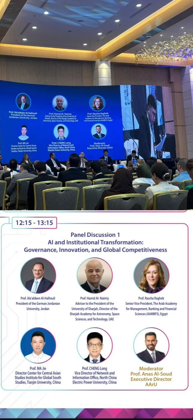 10月18日,由中国高等教育学会与阿拉伯大学协会联合主办的中阿大学联盟交流机制2025年工作年会暨第二届“大学与人工智能技术”国际会议在约旦安曼隆重召开。本次会议以“人工智能驱动下的中阿高等教育创新合作”为核心议题,汇聚中阿两国高校界精英力量,共商教育协同发展与技术融合应用大计。天津大学全球南方研究院作为中阿高等教育合作的积极参与者,派出英才副教授马杰参加了此次会议。