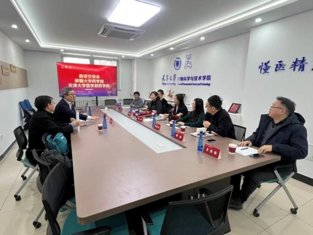 12月11日,新疆大学药学院院长苏正定、副院长蔡圣一行来访天津大学医学部药学院,开展对口支援工作交流。天津大学医学部药学院院长刘秀云、党委书记吴晶、副院长陈瑞冰、穆昕、董玮及教师代表樊爱萍、王东华等参加座谈。