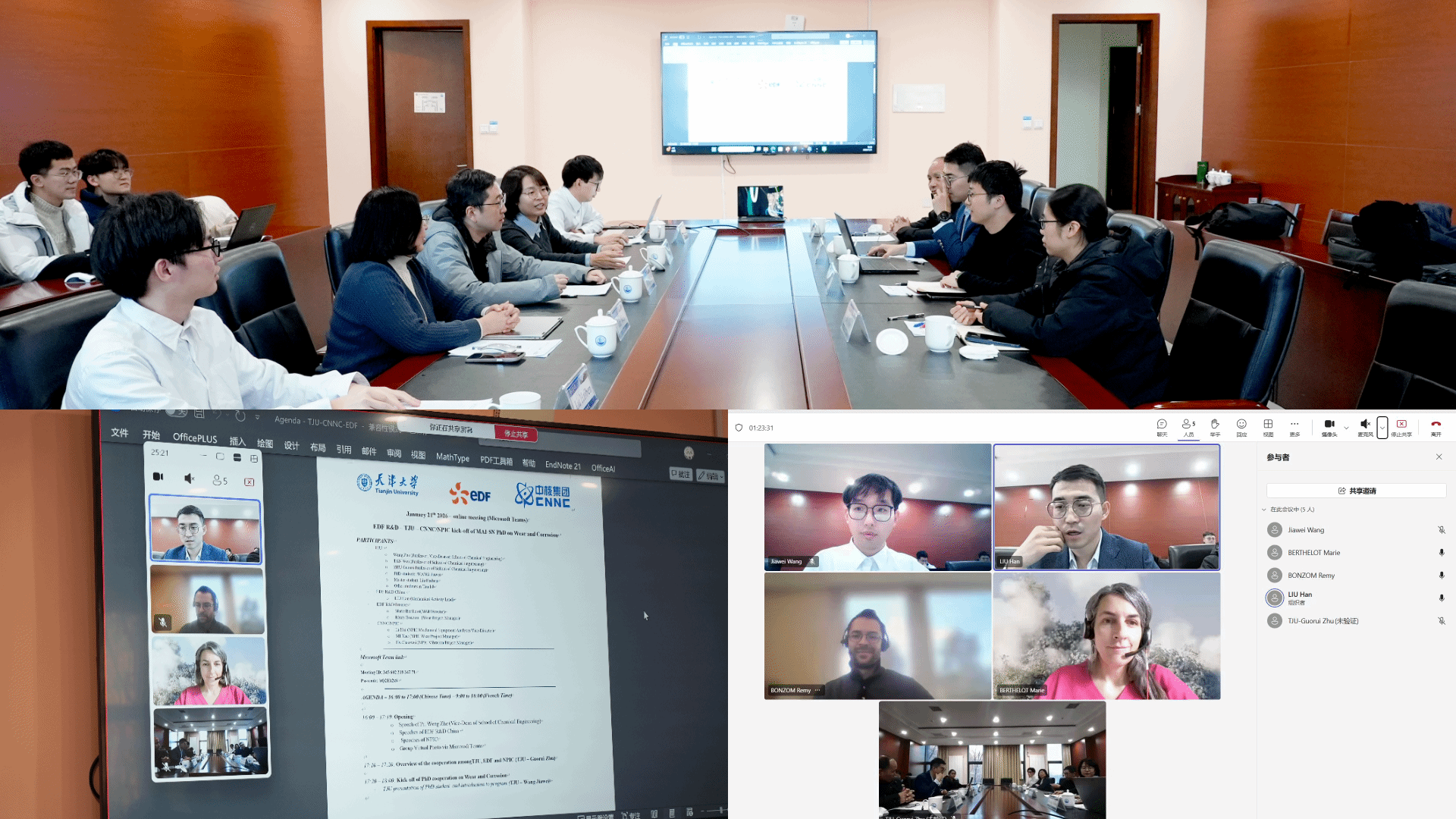 参加本次项目签订及启动会的有法国电力集团MAI主任Marie Berthelot、项目经理Rémy BONZOM、法国电力集团中国研发中心项目经理刘晗,中国核动力研究设计院力学室副主任李辉博士、米雪博士和胡朝威研究员高级工程师,天津大学化工学院副院长翁哲教授、谭蔚教授、朱国瑞教授、二期项目入选博士生王嘉炜等。