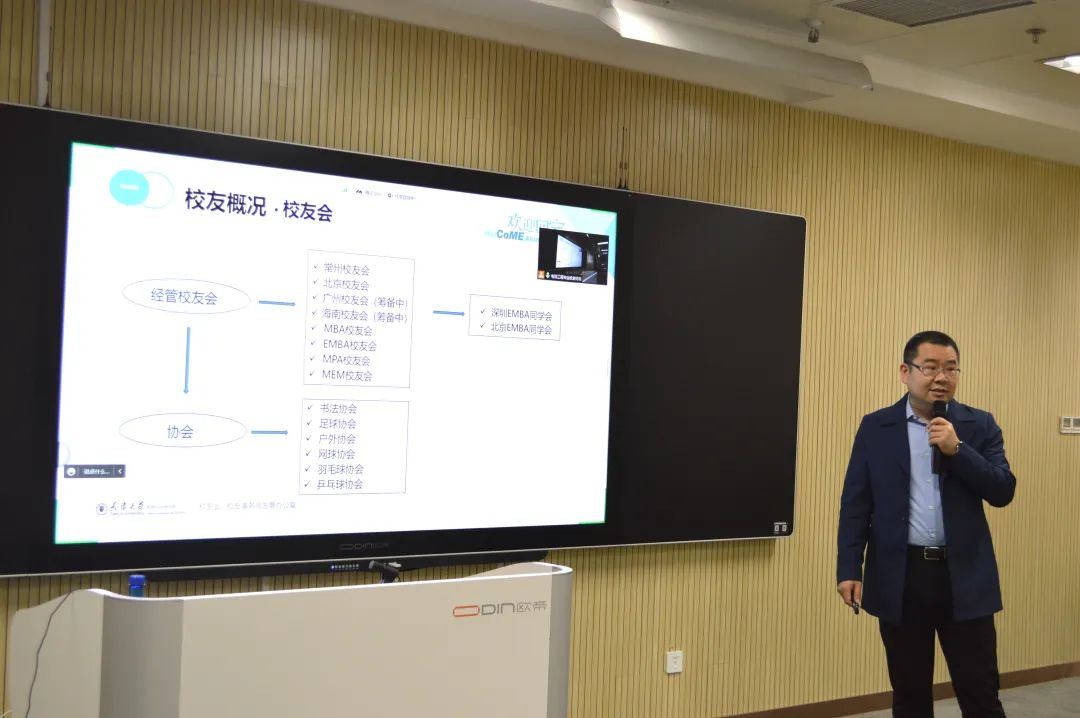 李文强做校友工作介绍。他指出,“链接、赋能、共创、成就”是校友办公室一以贯之的“CECA工作体系”。为加强校友与母校之间的情感沟通,校友办公室特别设立校友联络员职位,同时开设“天大经管校友之家”公众号,定期向校友发送校友工作简讯、生日祝福卡,发送贺卡贺信,做好情感链接。建立终身学习体系和终身服务体系,整合学部内外各类资源,共同推进校友工作,助力学部发展。