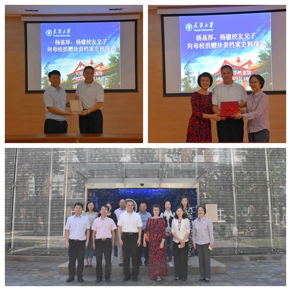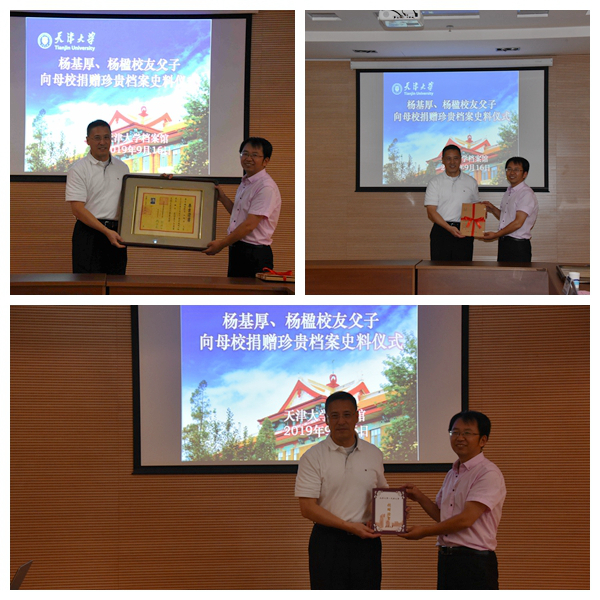 捐赠仪式上杨楹校友将其父珍藏的1951年北洋大学毕业证书和本人1981年天津大学研究生入学考试准考证及研究生录取通知单等珍贵史料郑重地交给档案馆馆长韩宝志,韩宝志为其颁发了天津大学捐赠证书。