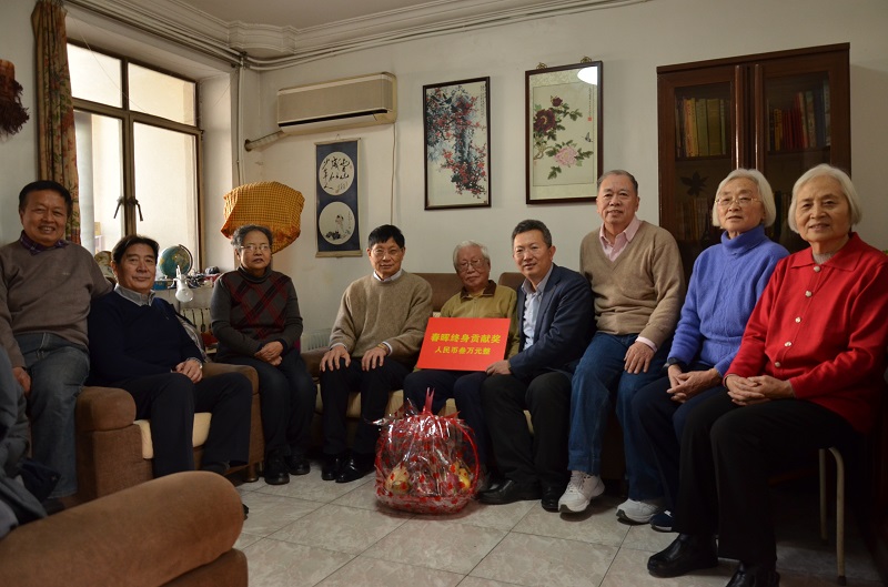 12月16日,春晖教育基金捐赠人、65英语师资班杰出校友田真声、刘小兰、汪大维、李华、赵伟明、俱银雪、曹青在校友与基金事务处处长潘峰陪同下看望春晖终身贡献奖获奖者、著名学者张中英教授。