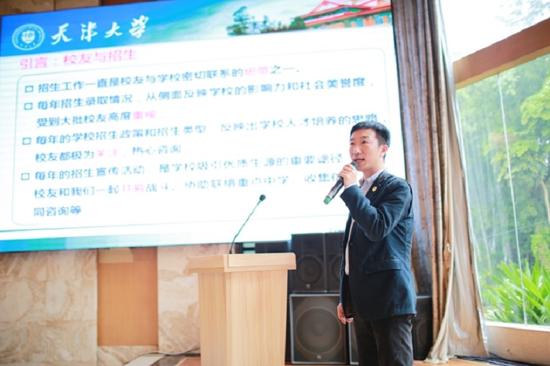 学校研究生院综合办主任、广西招生组卢铮松介绍了母校招生工作情况,表示招生工作一直是校友与母校密切联系的纽带之一,每年招生质量的提高,反映学校的影响力和社会美誉度的提升,也体现了校友们对母校的深情厚谊——每年招生季,在广西校友会组织下,大批热心校友积极协助学校招生组开展工作,吸纳越来越多的优质考生报考天津大学。他还介绍了在校的广西籍教师代表及优秀学生代表的情况,希望广西籍同学能取得更快的进步、获得更大的成绩。