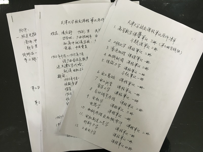 凌庆舒先生是60级电机与动力工程系电机电器专业甲班学生。在校就读期间曾任甲班印度尼西亚留学生和乙班越南留学生的辅导员,入住22斋留学生宿舍。毕业后先后任职于广西百色电机厂、广西机械工业研究所、广西产品质量监督检验所。凌庆舒先生一直心系学校的档案工作,在将学生时代的手写课程笔记40余册捐献给档案馆的同时,认真书写了个人简历及相关资料简介,为档案入库工作提供了非常详细地数据支持,也更好地还原了档案的历史性和真实性。从40余册保存完整、字迹工整的高等数学、工程化学、机械制图等笔记中我们看到了作为一名天大学子的严谨学风。从手写的资料详述中,我们看到了老天大学子对学校档案工作的无私支持。